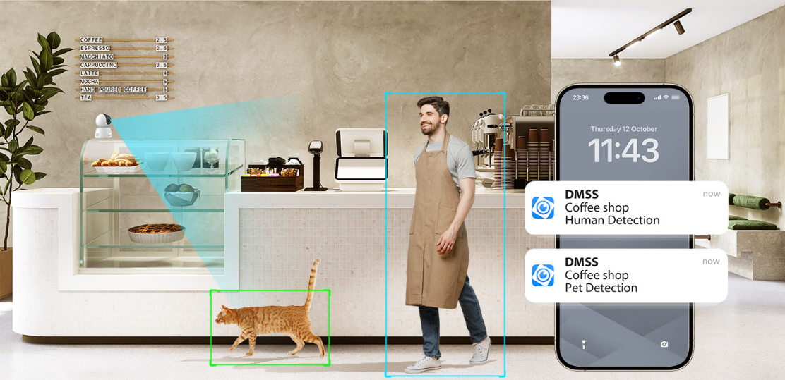 Las cámaras de la serie inalámbrica Dahua no solo son fáciles de instalar y usar, sino que también ofrecen un rendimiento excepcional y una excelente relación calidad-precio. Ofrecen una cobertura total de la escena con una resolución de 3 MP, giros de 0° a 350° e inclinación de -5° a 80°. Sus potentes funciones, como la llamada proactiva con un solo clic, la alarma preestablecida, la detección de personas y mascotas con IA, y el seguimiento automático, facilitan la detección precisa y el seguimiento continuo de objetivos. La información también se envía sincronizada a tu teléfono para mantenerte al día. Estas cámaras se utilizan ampliamente en entornos pequeños y medianos, como pequeñas tiendas minoristas.