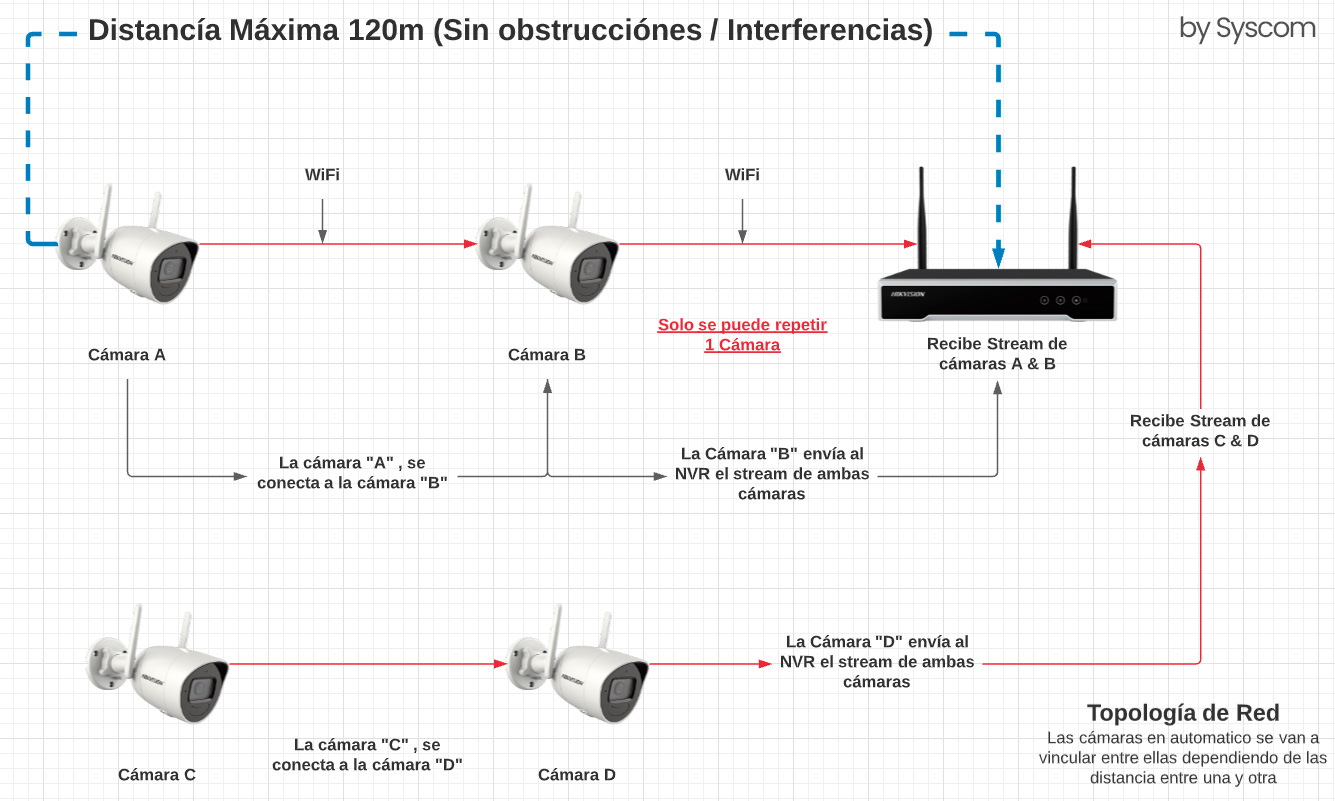 Automáticamente, la cámara WiFi mas lejana puede conectarse a una cámara WiFi cercana (como repetidor) y luego va al NVR para conectarse Así disminuye la posibilidad de perder conexión al estar fuera de el rango de cobertura