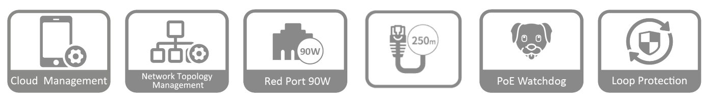 Los puertos rojos admiten los estándares IEEE802.3af, IEEE802.3at, IEEE802.3bt y HiPoE, con un consumo máximo de energía de salida de 90W.